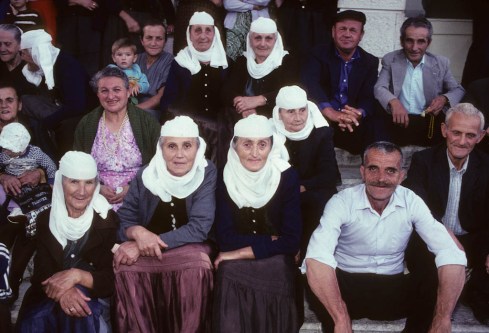 Some older folks in my village, Dervitsani, in the valley of Dropoli, the women with the characteristic white headdress of the region (click) (photo from Michel Setboun)