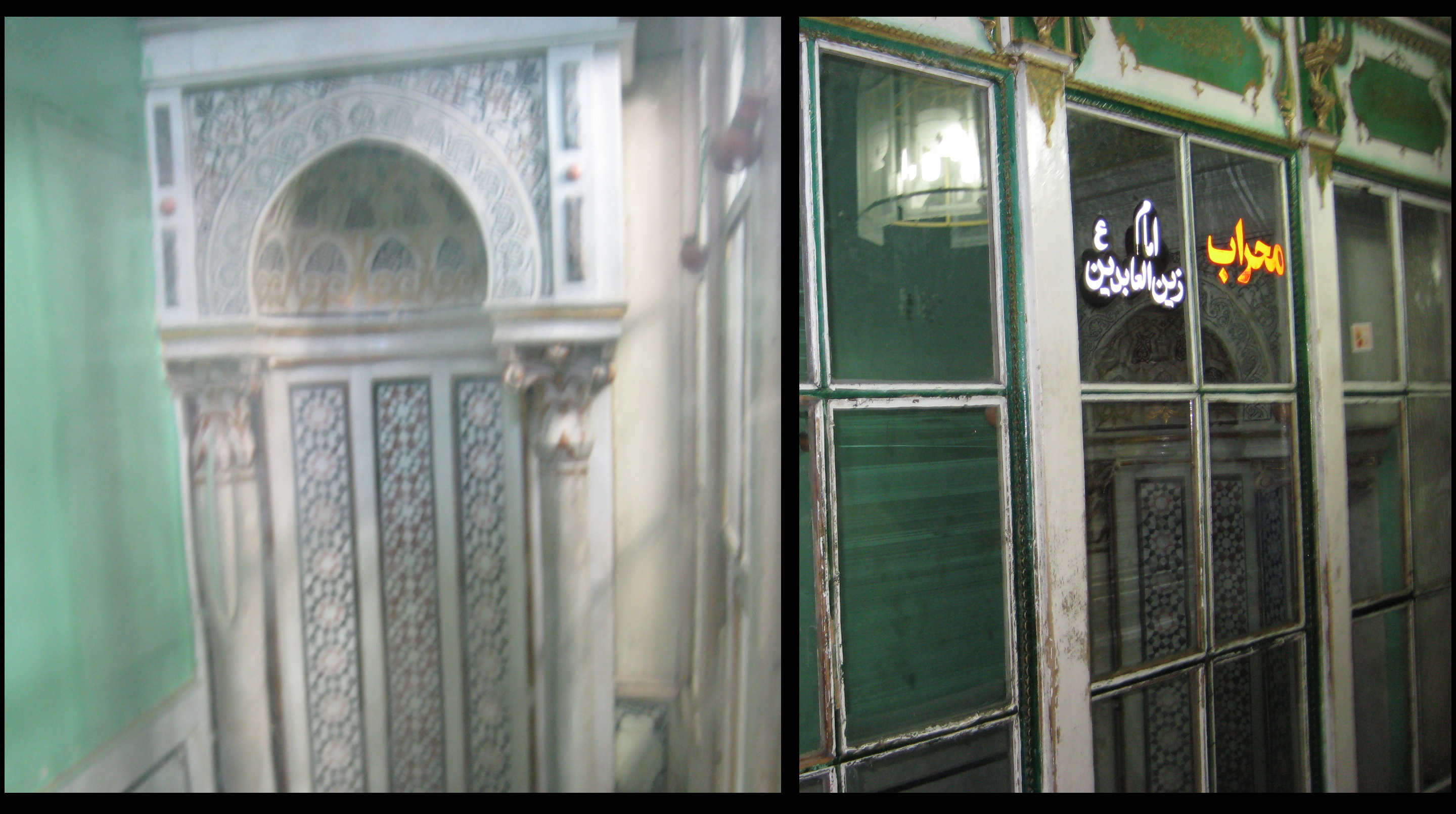 The white pulpit marks the place where ‘Alī ibn Husayn addressed the court of Yazīd and the raised floor in front of it marks where the prisoners of Karbalā stood during that time.