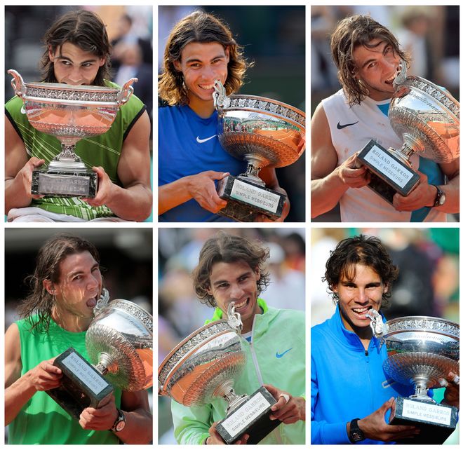 A combination of AFP files pictures made in Paris on June 8, 2012, shows Spanish Rafael Nadal biting his trophy after his six victories in the men’s final matches of the French Open Tennis at the Roland Garros stadium, from top, Lto R, on June 5, 2005 after winning against Argentinian Mariano Puerta, in June 11, 2006, in June 10, 2007 and in June 8, 2008 after his victory over Swiss Roger Federer, in June 6, 2010 after his victory over Sweden’s Robin Soderling and in June 5, 2011 after his victory over Roger Federer. (AFP PHOTO / THOMAS COEX / ERIC FEFERBERG / JACQUES DEMARTHON / MIGUEL MEDINAAFP/AFP/GettyImages)