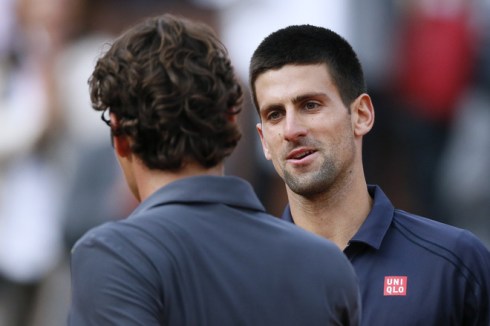 Serbia’s Novak Djokovic celebrates after winning against Switzerland’s Roger Federer their semifinal tennis match of the French Open tennis tournament at the Roland Garros stadium, on June 8, 2012 in Paris. (AFP PHOTO / THOMAS COEXTHOMAS COEX/AFP/GettyImages)
