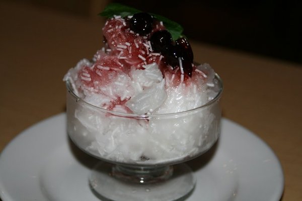 It’s frozen vermicelli noodles made either from corn starch or rice flour, with sour cherry syrup on it and lotsa lime juice, sometimes pistachios or mint leaves too. The lime heightens the sweet-tartness of the vyssino-visne-sour cherry tartness in that subtle, complex juxtaposition of fruitiness and sourness that Iranians are such experts at (in desserts and all foods), and it turns into the most refreshing, delicious slushy you could ever want to eat. Sold on the street apparently in Iran, it must be heaven to have in the heat and dust. I fantasize about it when the weather gets like this.