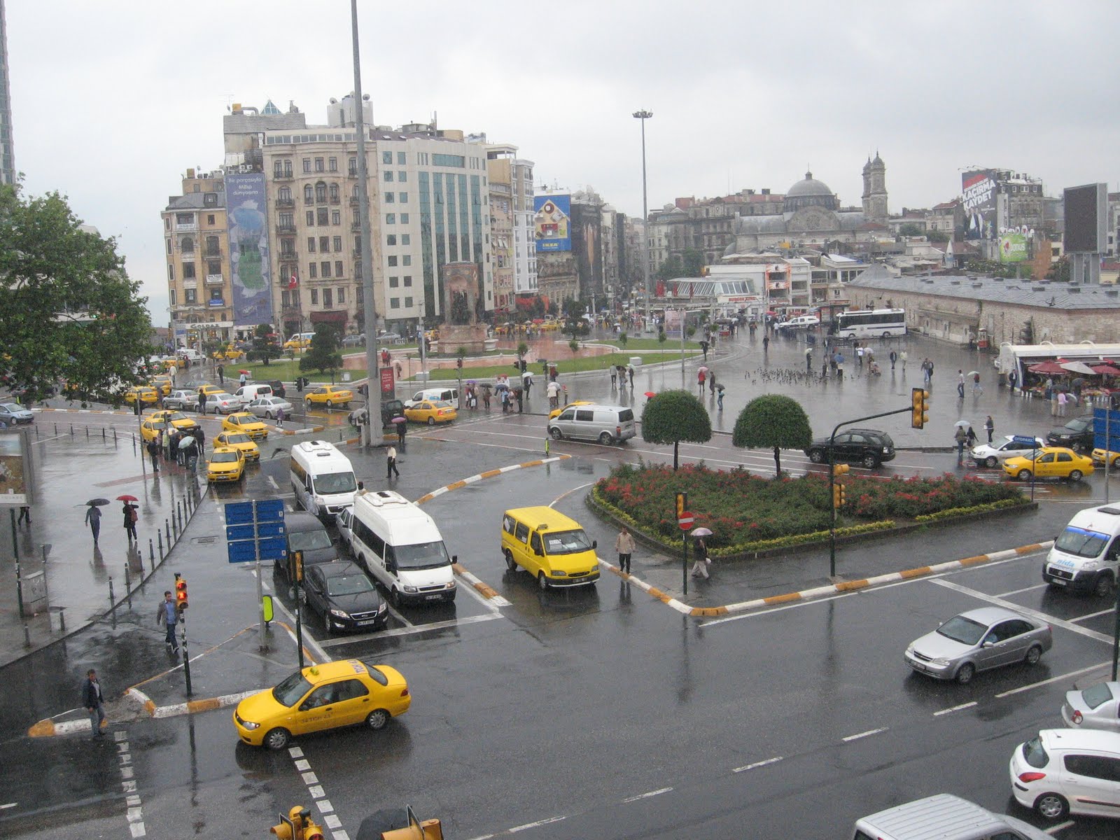 Finally, one can only imagine what the AKP planners have in store for the point where Tarlabaşı Bulvarı finally reaches Taksim. Taksim is often described as İstanbul’s central square but it is and has for a long time been only an ugly traffic intersection. Like Columbus Circle in New York, it’s been an almost impossible space to beautify and like a dish that starts off badly, the more you try to fix it –maybe some more salt, maybe some more water — the worse it gets. It’s the top of a hill; the peak of the Pera ridge actually, and it has a top-of-the-hill, convex feel, but without having any views around it, which is very physically disconcerting. More than one Modern Greek fiction source says that there used to be a view. On top of that, none of the surrounding buildings refer in any way to the shape of the space, all their facades facing the streets that run off the square and not the square itself, and there’s a park on the north that I’ve never actually gone into (maybe there’s a view from there) but is fronted by an unattractive strip mall of shops, though on the south side the wide plaza that’s been formed by the pedestrianized Jadde’s entrance into the square, against the stone building which I’ve never managed to learn the identity of (on the right of photo below — is that the reservoir?), is very pleasant and piazza-like.