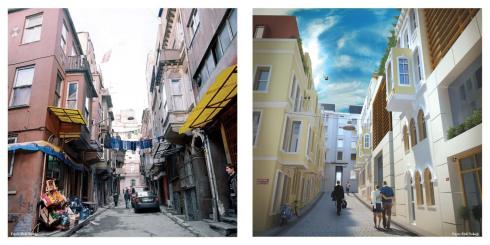 A before and after of Fıçıcı Abdi Sokağı — happy blonde couples, a salaryman with his briefcase, no more laundry or Kurds or unsanitary manavedes, and — of course — a bicycle. (Click — you must click to appreciate the sheer and nauseating classism of these images)