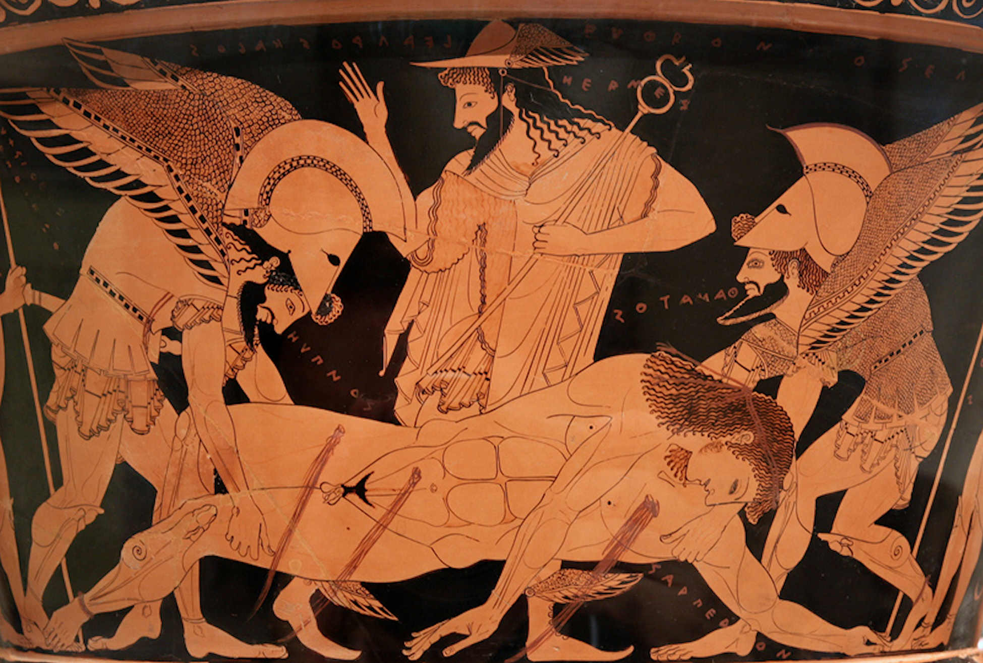 “Euphronios, one of the first to work in the red-figure method, uses his simple but skillful technique to draw the hero’s body at the moment it succumbs to death. Especially vivid are the three open wounds on Sarpedon’s body from which blood spills to the ground. Sarpedon’s eyes are closed, his limp hands drag along the ground. Zeus, powerless to prevent his son’s suffering and death, sends the god Hermes to attend to his son’s burial. Hermes, in turn, summons the caretakers Sleep and Death to transport Sarpedon to his grave.”