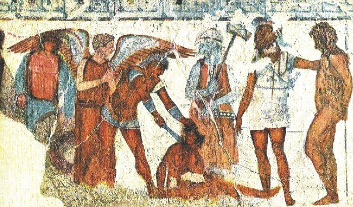 Achilles’ sacrifice of the 12 Trojan prince POW’s at the funeral of Patroclus. Part of a wall painting in the Francois Tomb, Vulci, 350-330 BC. Museo Torlonia, Rome.