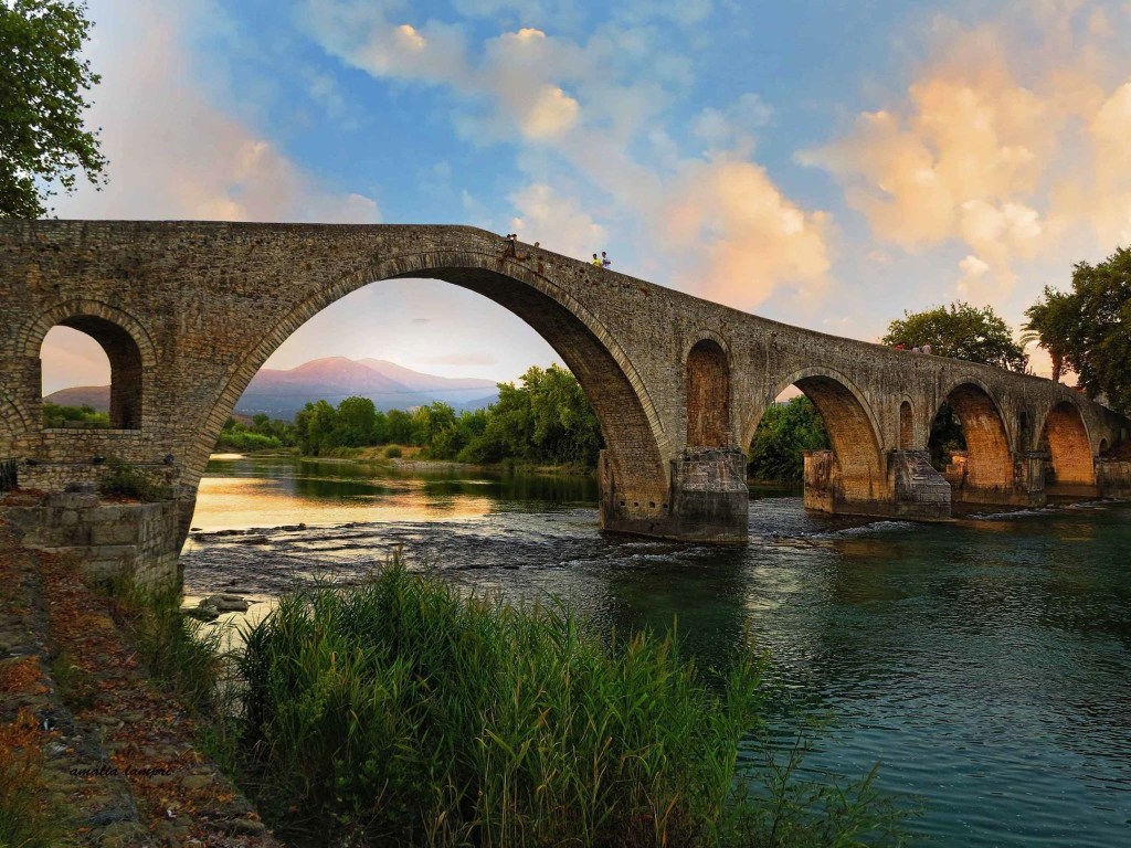 The Arta version is particularly cruel: the young blue-eyed Georgian warrior’s sacrifice is at least voluntary. In Arta, the master builder’s wife comes to bring him his meal at the construction site; he has already been told the prophecy that a human being needs to be buried in the foundations. The builder acts despondent. She asks what’s wrong. He says my wedding band slid off and fell into the river. She says: “I’ll dive in and get it for you, my love.” And as soon as she does, the builders start laying the stones on top of her. As she’s being immured alive, she curses the bridge and asks that anyone who crosses it be blown off like an autumn leaf and drown in the river. The builders remind her though, that she has a brother in “xeniteia” (an emigrant — again the theme of emigration, separation and loss in Epirotiko culture) and “when he comes home you don’t want him to drown as he tries to cross the bridge, do you?” She says, basically, “oh yeah, that’s right”, rescinds her curse and the bridge stands and travellers use it safely.
