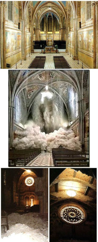 Below, the collapse of the interior of San Francesco di Assisi in 1986.