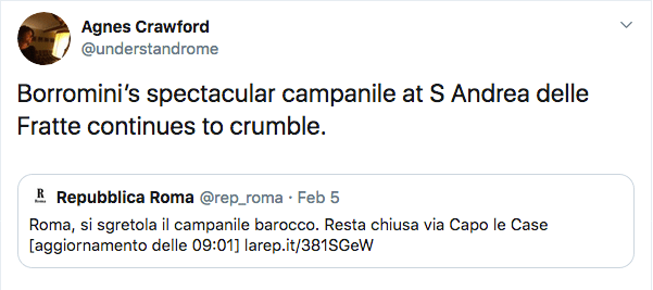 From: Repubblica Roma@rep_roma and “Roma, si sgretola il campanile barocco. Resta chiusa via Capo le Case“