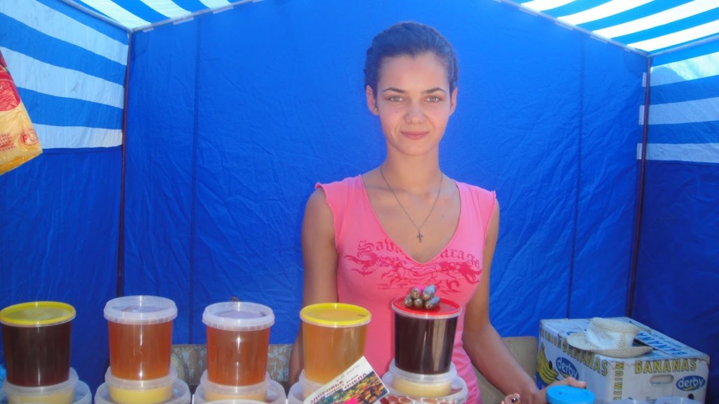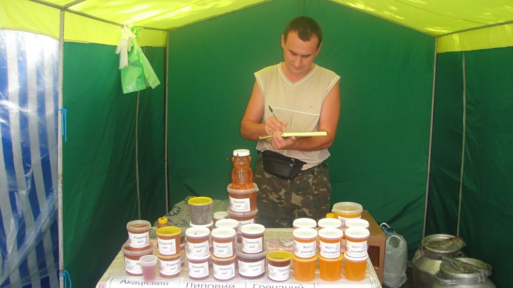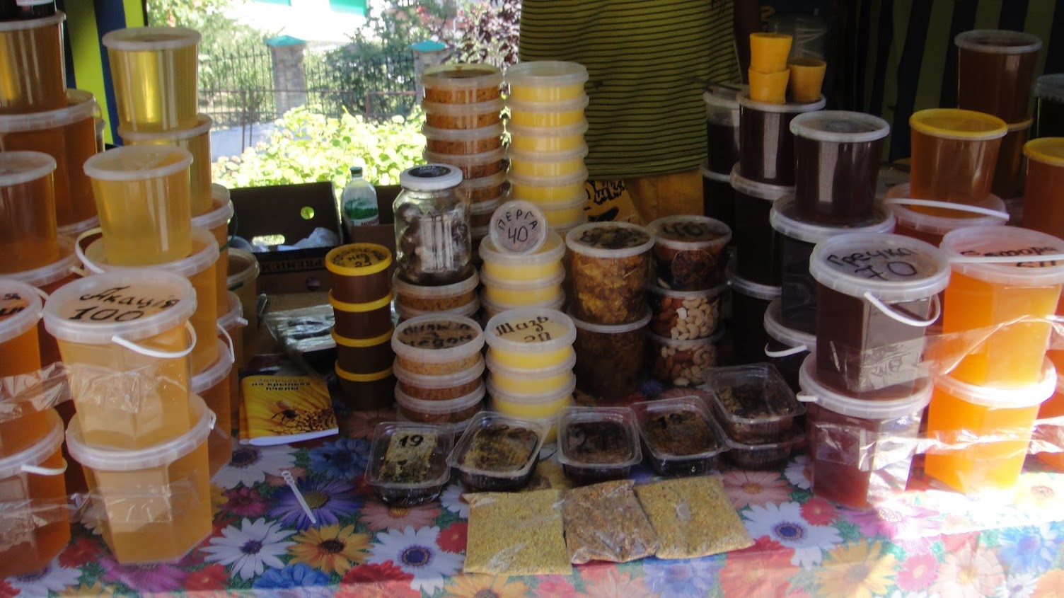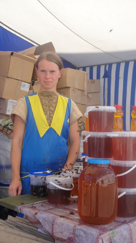 In August of 2010 I was in Kiev for the first time since the fall of communism. I was lucky enough to stumble upon a honey festival — honey being one of Ukraine‘s and Russia‘s and wooded eastern Europe’s valuable trade product for centuries — that that year was held on the grounds of Kiev’s Pecherskaya Lavra – Києво-Печерська лавра, one of the most stupendous collections of churches and monasteries in the world and most sacred to both Russian and Ukrainian Orthodoxy (not a pretty dialogue these days): a farmers’ market from the countryside surrounding the city, and they all brought their honey and other bee-related products to sell.