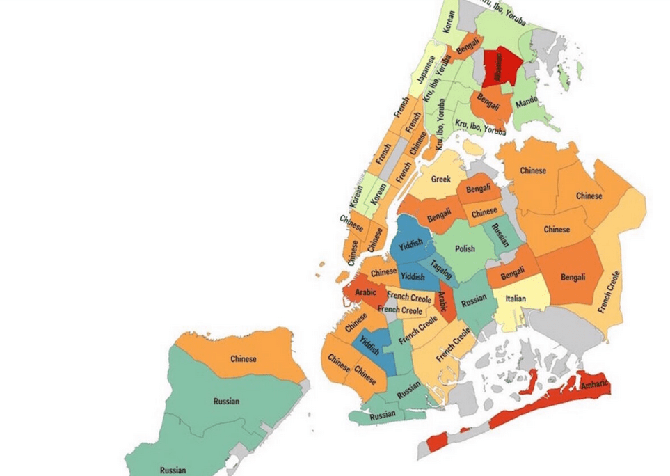 O.K. Upon examining better, this map is totally bonkers. How can there be NO predominantly Spanish speaking neighborhoods in New York? Not in Jackson Heights? Not in Washington Heights? Not in the Barrio or South Bronx? And who are all these French-speakers on both the Upper East and West Side? And Far Rockaway doesn’t have any Black English speakers? Just Amharic-speaking Ethiopians? And there are no Italian speakers in Staten Island?