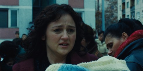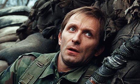 Of course the two you can’t take your eyes off and can’t get out of your head afterwards are the two leads: the painfully sexy Goran Kostić as Danijel, the Serbian cop thrust into the role of Bosnian Serb army captain, and Žana Marjanović as the inscrutable Ajla, the Muslim woman he falls for, one of those close to six-foot Dinaric beauties that make you hate all ex-Yugos; she goes out in one of the opening sequences in heels, a blue dress and a traditional silverwork belt and makes you want to cry, for all kinds of reasons.  I say inscrutable partly because a South American friend who saw the film described her as “parca,” which means dry or stiff or cold — the same root as “parched” maybe – and I had to explain that that attitude implies nobility in our parts, a posture that Ajla doesn’t slip from even for one moment, despite the hell she’s put through; in fact she clings to it even more desperately throughout, her dignity the only thing she has left, her only weapon against male power.  (“Archontia” is another word I need to give a full entry to at some point.)