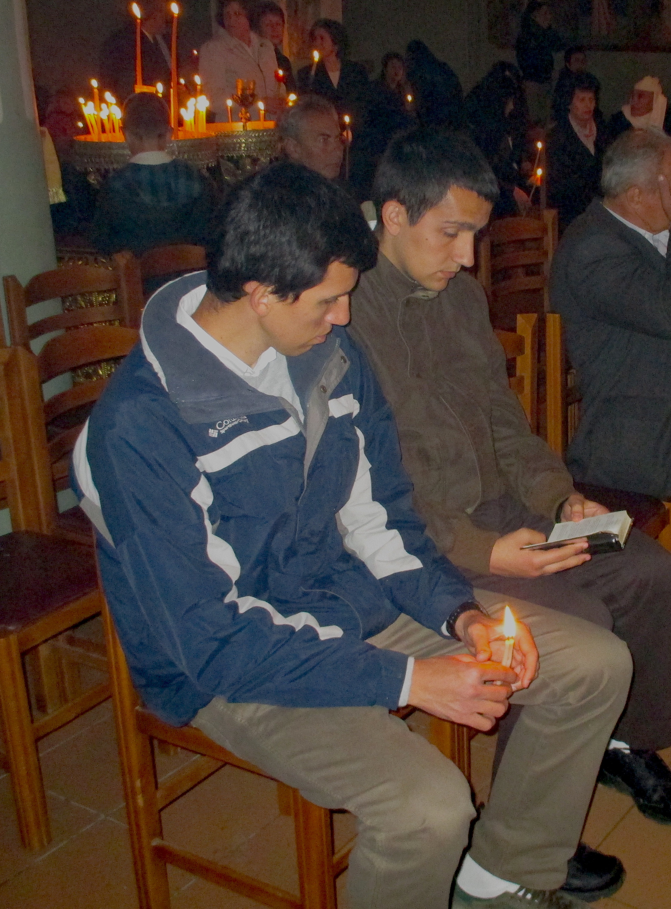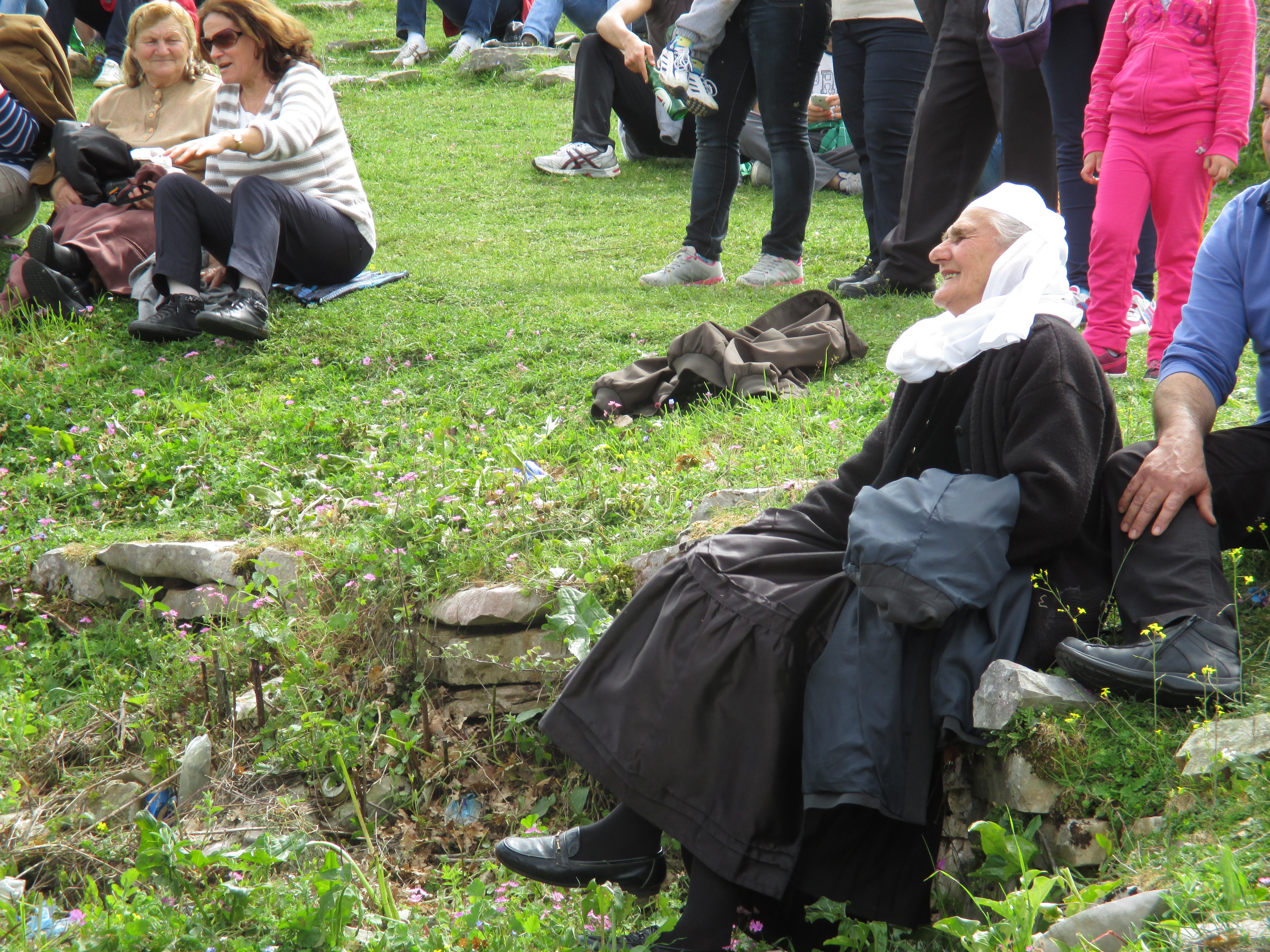 This is Calliope, with her two sons Vasili (left) and Vangeli (right) on Easter night in church (click). She’s an extraordinary and extraordinarily loveable woman: a great housewife, a competent businesswoman, funny, generous, always smiling, as flirtatious and open as a teenage girl — she’s one of my great relative-loves. Here she is below at the Monastery on Easter Monday, having just deposited a huge piece of lamb shoulder — no, actually, a lamb shoulder — on a paper towel in front of me, cold and glistening with shiny white fat like some Homeric offering. My father always loved cold lamb, and would never let my mother reheat it, because it reminded him of the Easter dance at the Monastery. This is a typical pose to catch her in below, because her innate generosity is always giving something to someone. (Click)