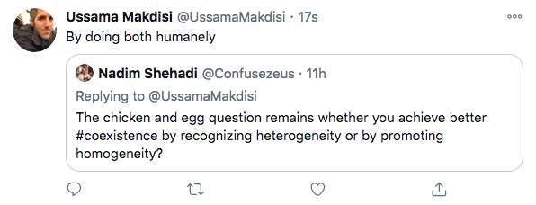 Translation: “I come from a very ancient tradition of Mediterranean and MENA urbanism and cosmopolitanism which was destroyed by the modern ethnic nation-state and its ridiculous ideas about cultural uniformity”
