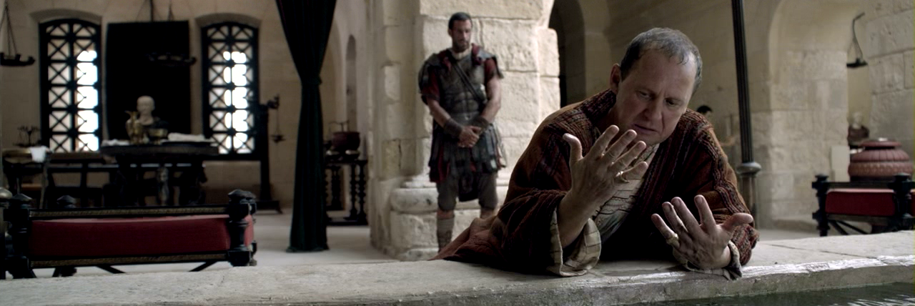 Unknown until now comes Clavius (Joseph Fiennes), looking every bit the Roman tribune: appropriate attitude, soldierly, fit and tan. He’s also dreaming of serving Rome, then finishing his military duty and duly retiring to some lovely Horatian farm idyll in Italy, with olives, vineyards, oxen and a wife. Clavius is a by-the-book man too, but he’s got a slightly different edge about him than the others. He’s relatively kinder and permissive with his men. He’s got an immediately sharper eye for what pushes the “natives” buttons — not to be confused for compassion – and senses that there’s something different and even off with the Nazarene.