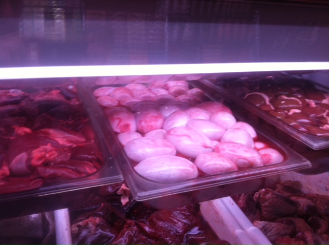 Bull balls at International, with liver to the left, kidneys on the right, spleen on bottom left, hearts on bottom right.