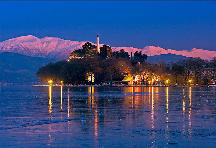 But then it is often “so uniquely appealling,” to get back to the Turks and the Balkans. The main city of the region (Epiros) is Jiannena/Yanya, a beautiful little city by a lake that always had an air of luxuriant civility about it, proof of which may be that the Greek population didn’t rush to pull down the minarets or demolish all the mosques of the city as soon as the last Turks left in the twenties.* It’s one of those Balkan cities the Turks loved. Here’s a winter photo of Yanya’s main cami, the Aslan Pasha Mosque, overlooking the icy lake, below. (click)