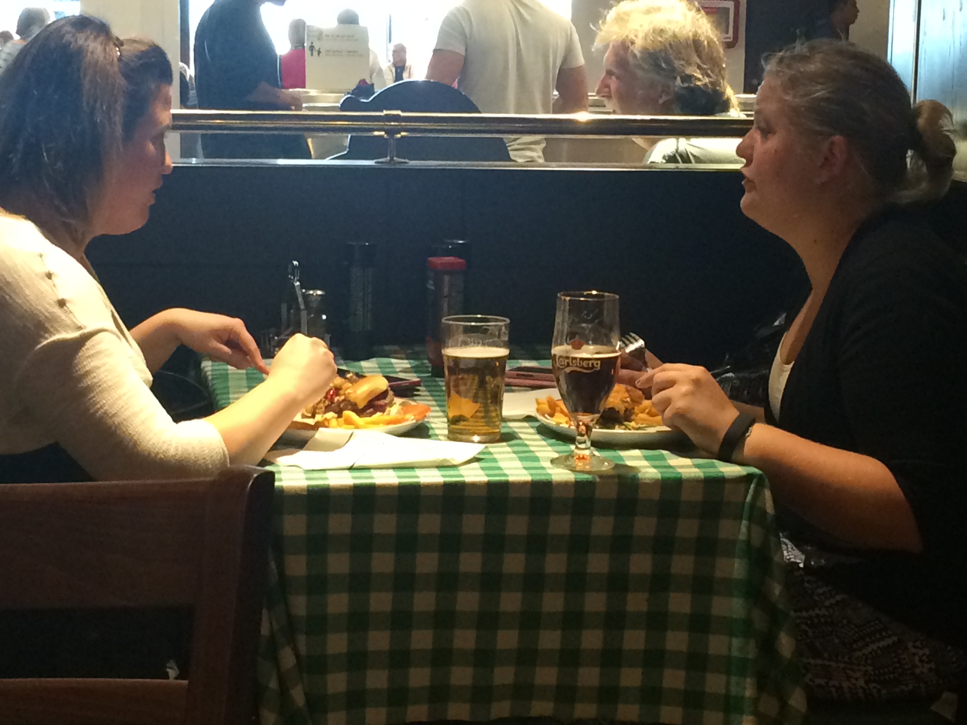 I get a Brooklyn Lager at the fake Irish pub. I look at the hamburgers and nachos and buffalo wings menu with disgust. Not a piece of herring in sight. Two young girls are eating bacon-cheeseburgers next to me with their forks and knives.