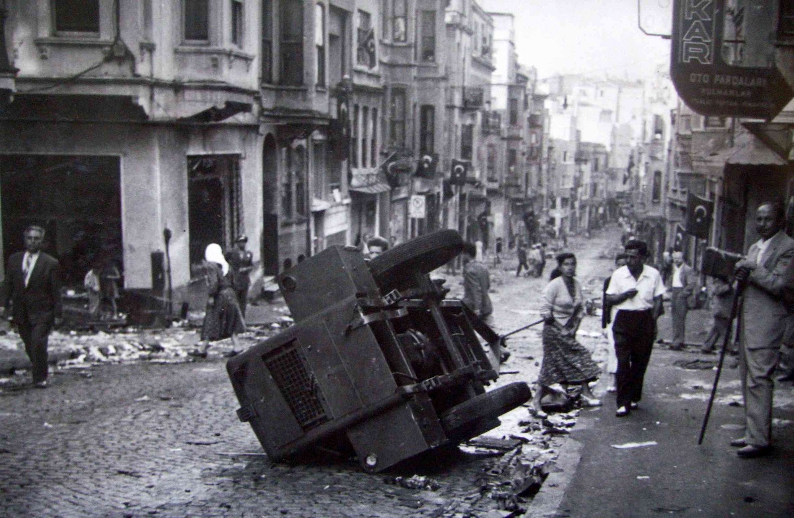 The Menderes government initially, and stupidly, tried to portray this as a spontaneous outbreak of nationalist fervor against Greeks over growing Cyprus tensions, but it was actually an extremely well-planned and executed military manoeuvre (every Turk, after all, is a soldier born) carried out and directed by local cadres of the Demokrat Parti who knew their neighborhoods and its Greek properties and institutions well and through the use of Anatolians brought in from the provinces; I guess they were afraid that local İstanbullus, who knew and lived with these Greeks, would not be as easily destructive, though the record of how the city’s Turks did act during the riots is hardly edifying. As all products of the nationalist-militarist mind, the plan was an extremely stupid move as well. It brought the economy of Turkey’s largest city to a virtual standstill, at a time when the country was in deep economic doldrums to begin with, by ripping out its retail heart, so much of it being in the hands of Greeks and other minority groups, and in the immediate aftermath there were chronic shortages of basic supplies in the city because distribution networks had been completely severed and even bread — so many bakeries being Greek and Epirote, especially, owned — was hard to find. It temporarily made Turkey an international pariah (though in that Cold War climate that didn’t last too long) and eventually played a role in bringing the Menderes government down and costing him his life — thought that all is well beyond the scope of this post, this blog and my knowledge. Vryonis’ analysis is brilliant if you’re interested.