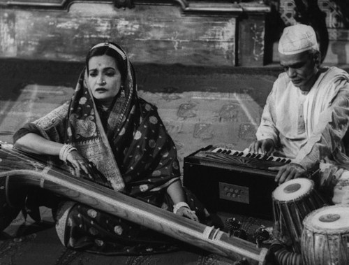 And below, in Satyajit Ray’s 1958 Jalsaghar (The Music Room), though here I need to own up to my ignorance and admit that I’m not sure if she’s singing a ghazal or thumri or some other genre. It’s also extremely annoying and, to say the least, odd, that Ray would disrespect her performance so much by pasting most of it over by cutaways of the audience and especially the film’s idiot nouveau-riche neighbor who doesn’t even know what he’s listening to:
